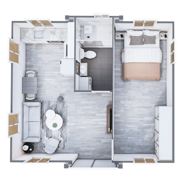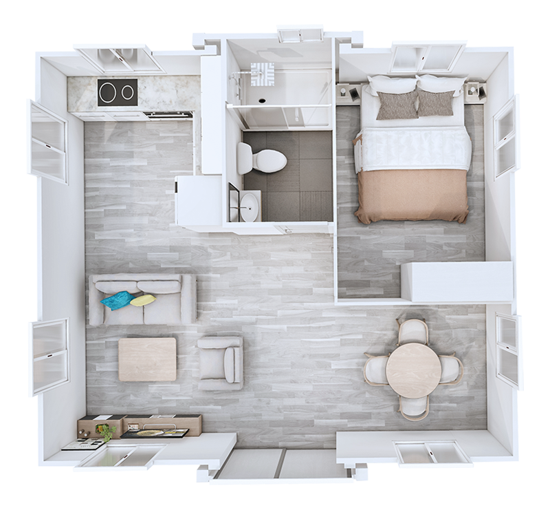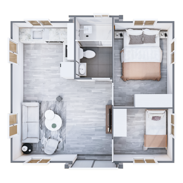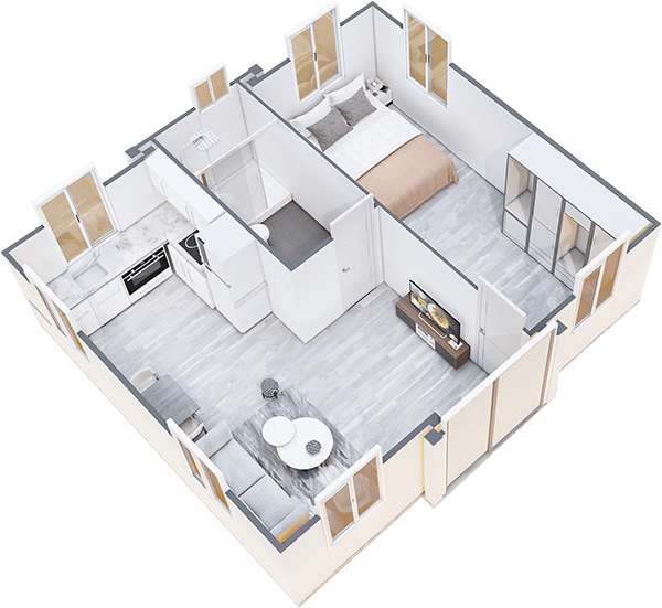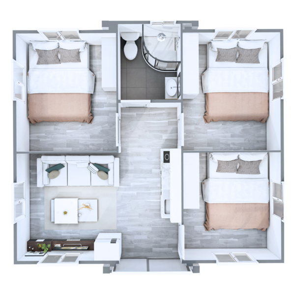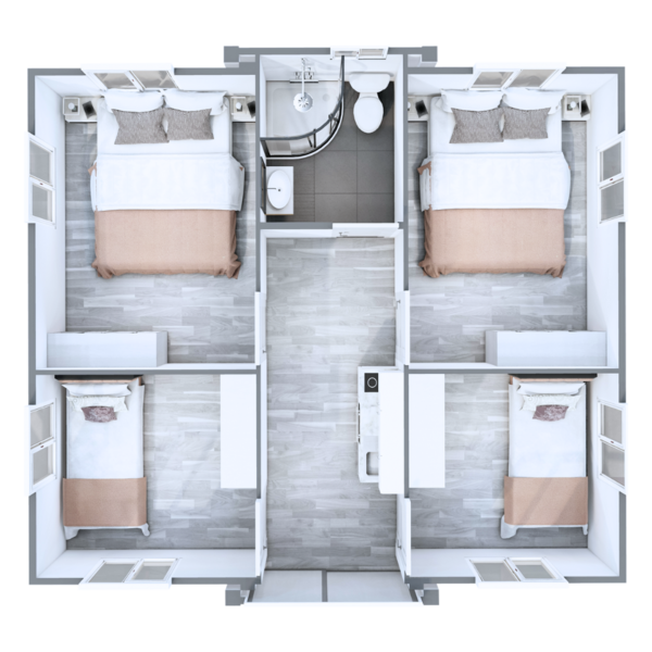 The floor plans of our Premium Space Cabins offer a comfortable and relaxed living experience while maximising the use of space and natural light. We have 4 unique floor plan options with 1, 2, 3, and 4 bedrooms, living space, kitchenette, and bathroom with shower + toilet.