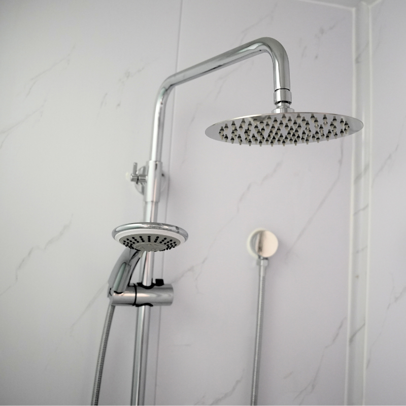 Full-width shower, shower rail, rainmaker shower head and frosted privacy glass door